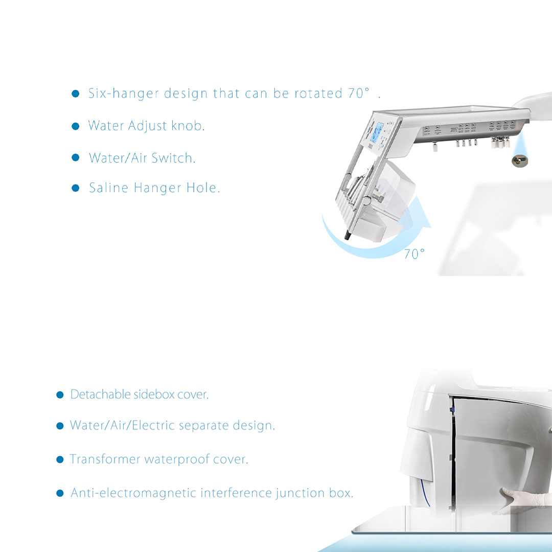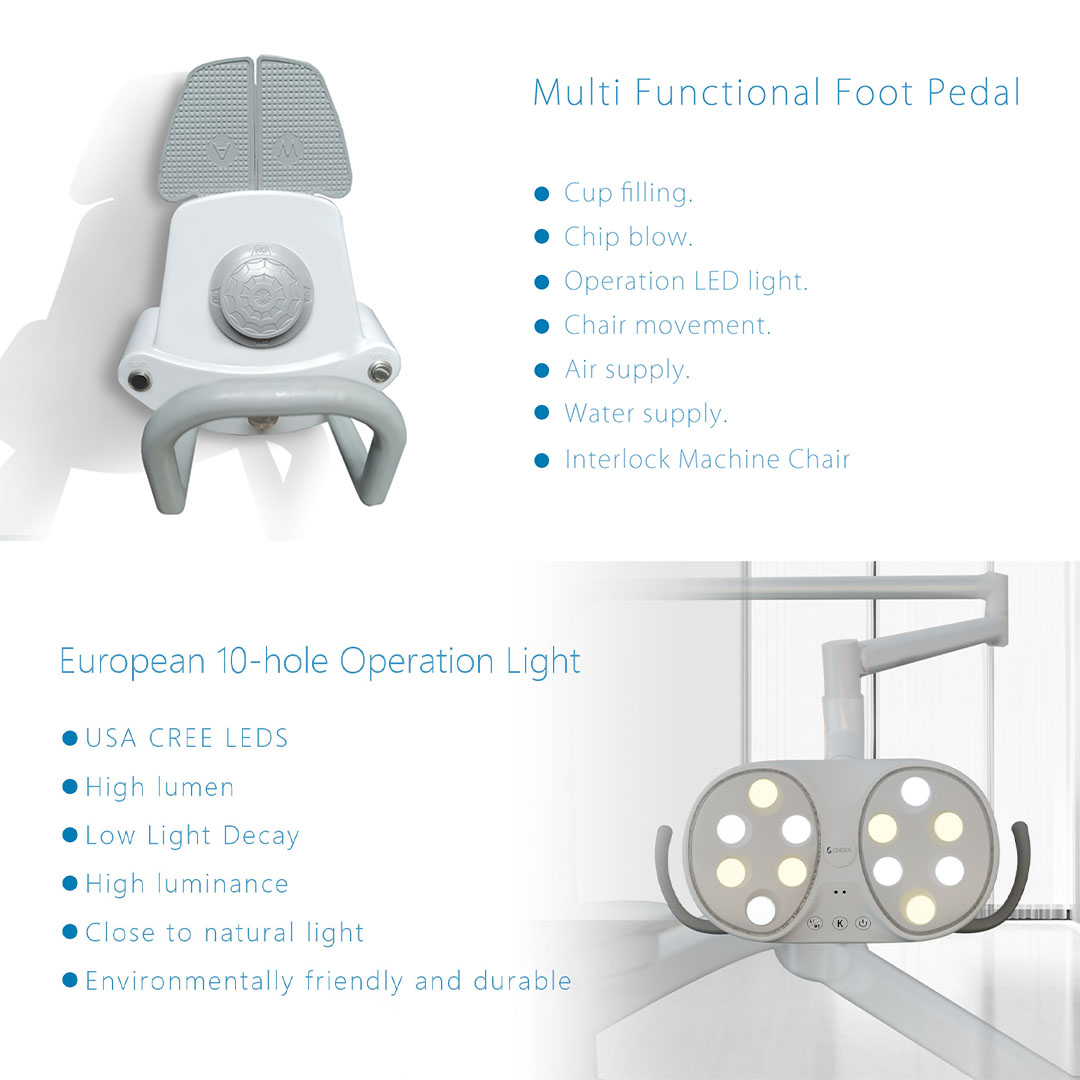 🔘 Convenient button panel instrument tray for easy access. 🔄 Rotatable dental unit cabinet box for seamless 4-hand operation and maintenance. 👥 Multi-functional Assistant Tray empowers assistants to manage chair position, cuspidor flushing, water heating, and cup filling. 🦶 Multi-Functional Foot Pedal ensures effortless control for dentists. 💡 Dimmable LED Operation Light provides shadowless focus and flexibility, enhancing ease of use. ⚙️ 3-In-1 Main Switch & Emergency Stop simplifies power, water, and air system control, with added safety features. 🪑 Ergonomic Doctor Stool with 6-way adjustment options for optimal comfort during procedures.