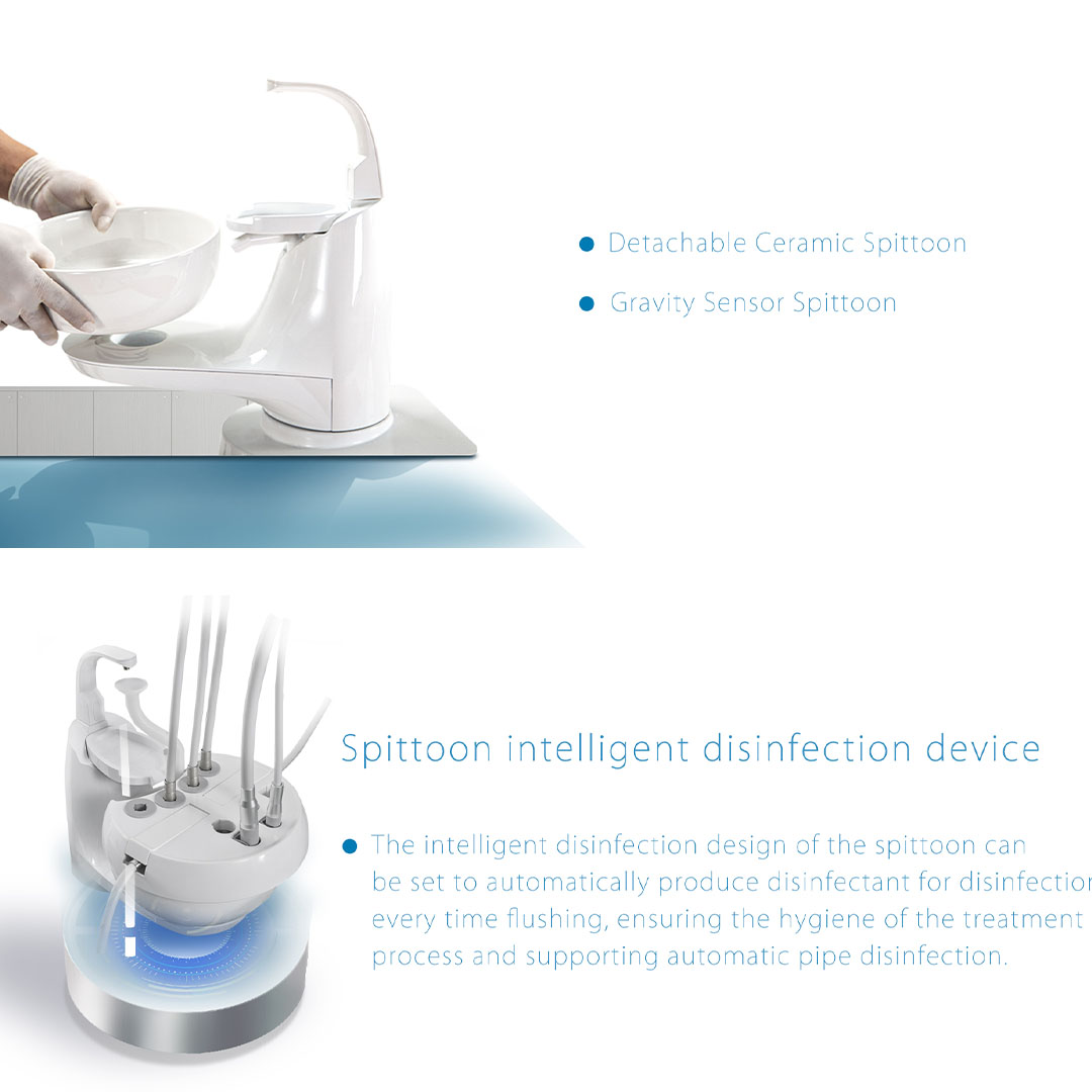 Disinfection & Hygiene System | Equipped with an automatic disinfection device for all hoses (syringe, scaler, handpiece, suction, and saliva ejector). Includes a warm-water supply through all hoses for enhanced hygiene and comfort. |